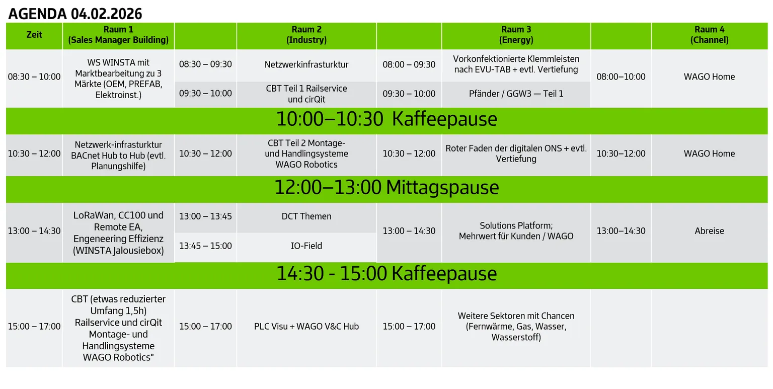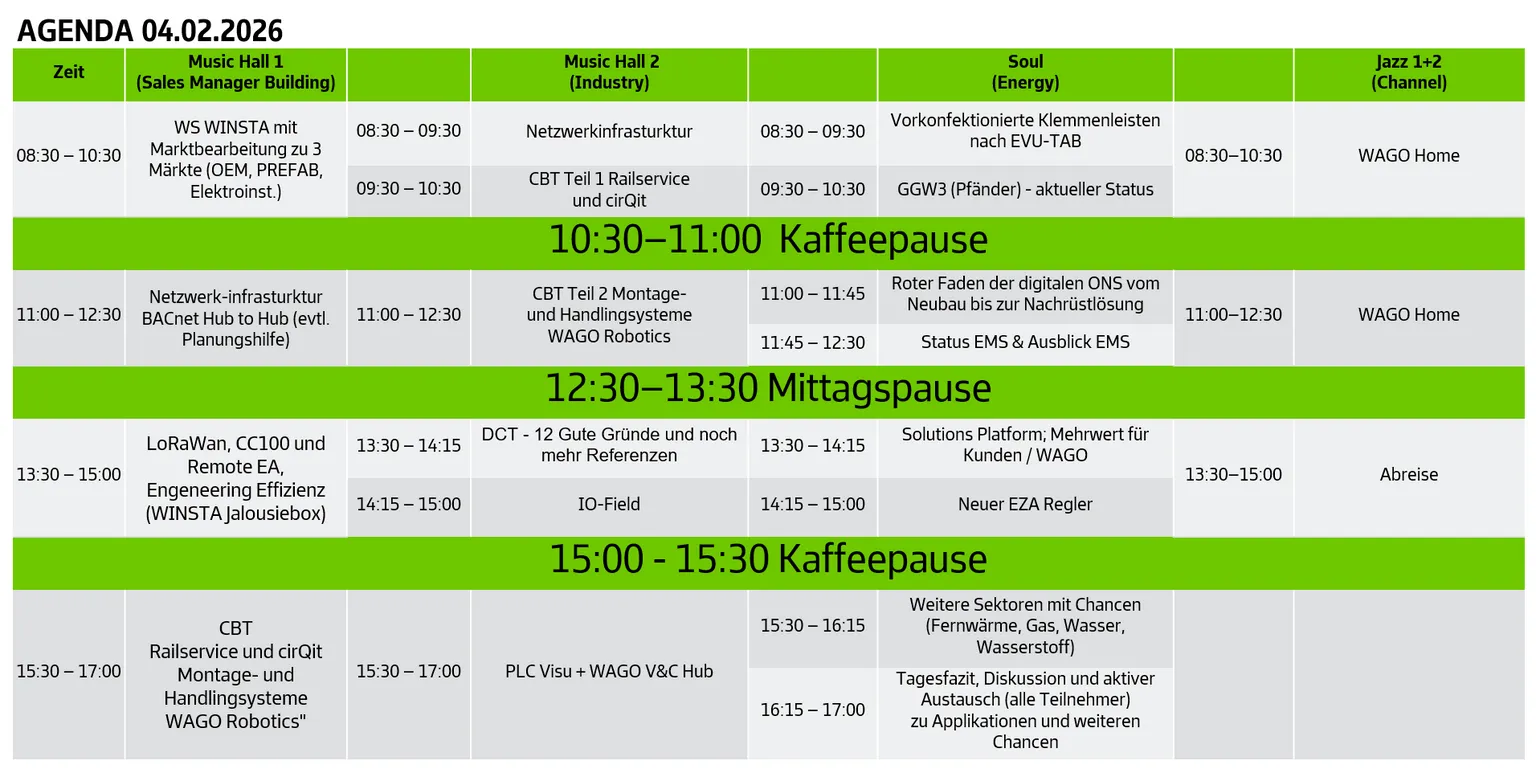 Eure Hotelzimmer sind vom 02.02 - 04.02.2026 oder vom 02.02. - 05.02.2026 für euch reserviert. Bei abweichenden Reisedaten wendet euch bitte bis zum 10.12.2025 an Alexandra Ditsch (alexandra.ditsch@wago.com).